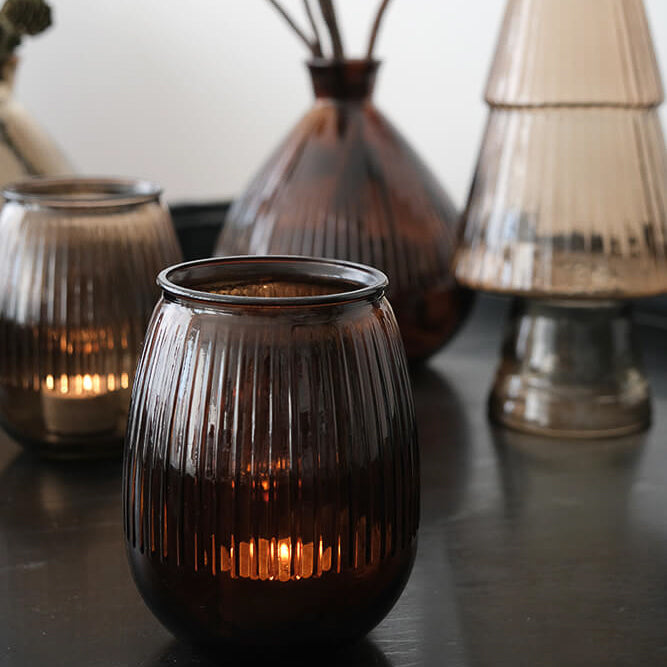 Die Keaton-Serie verbindet recyceltes Glas mit einem sanften Mocha Mousse-Ton, der Wärme und Ruhe in jeden Raum bringt. Die geriffelten Strukturen verleihen jedem Stück eine dezente Lichtwirkung und eine natürliche, organische Tiefe.